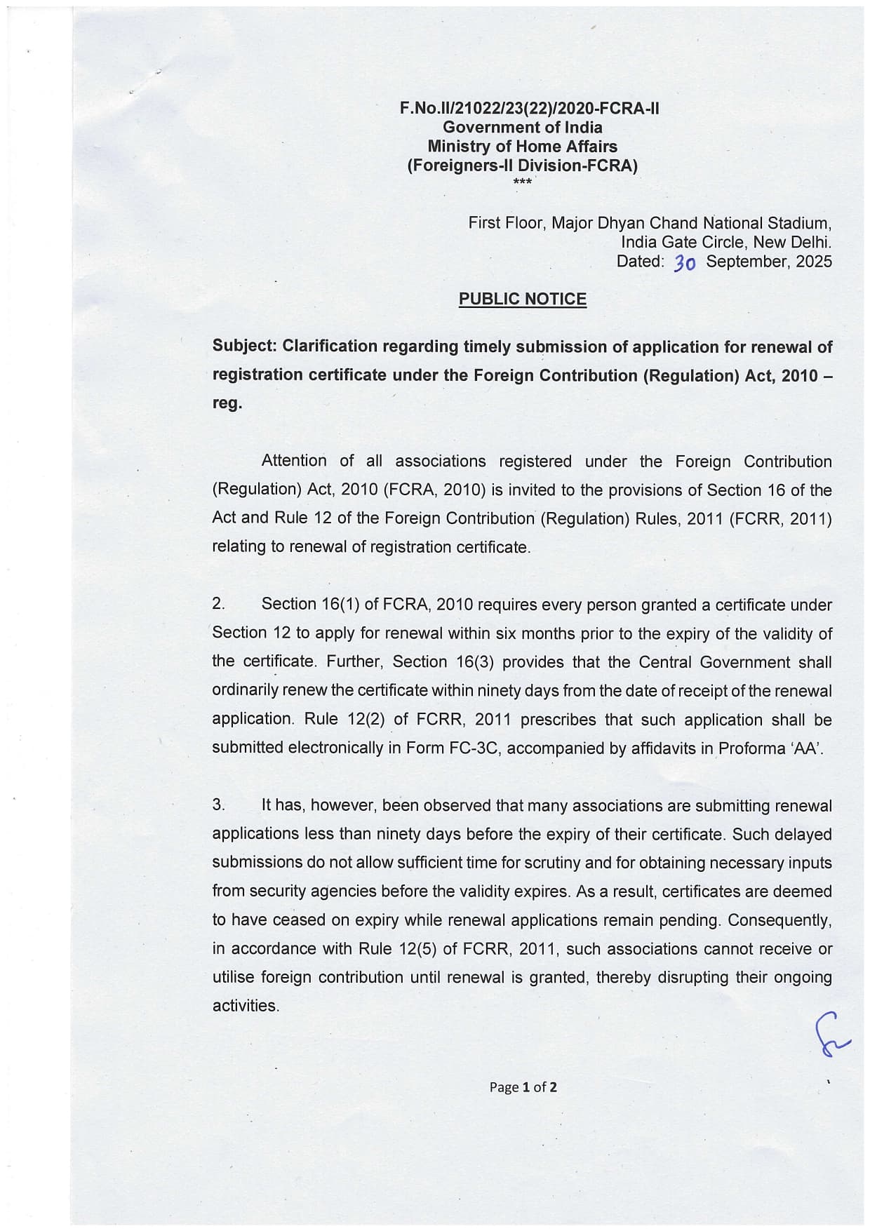 Download PDF: FCRA - Clarification Regarding Submission of Application for Renewal of Registration Certificate 30th Sept.pdf (1.4 MB)